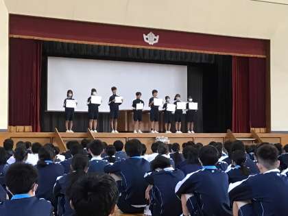 認証のあと、各種の表彰披露がされました。受賞されたみなさん、おめでとうございます。写真は、文詩集「ひまわり」で受賞された生徒です。