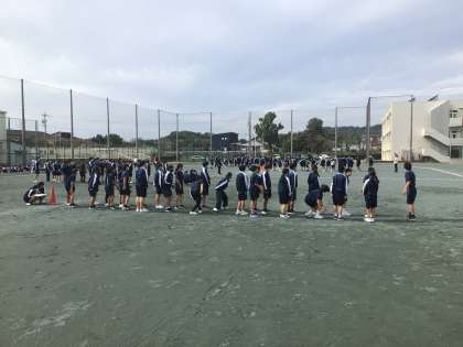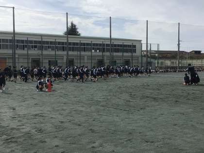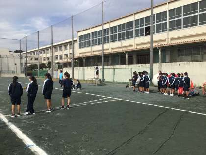 各競技の運営は、生徒が行います。器具の準備や片付け、アナウンスなどの確認をしながら、予行練習を進めていました。写真は長縄跳びのリハーサルです。プール側から、1組、2組、3組、4組と並んで競技を行います。