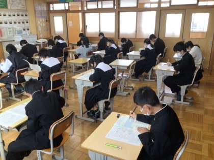 今日から1,2年生の中間テストが始まりました。今日と月曜日は、全学年テストとなります。1年生の様子です。