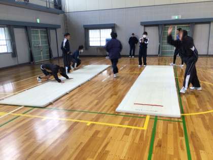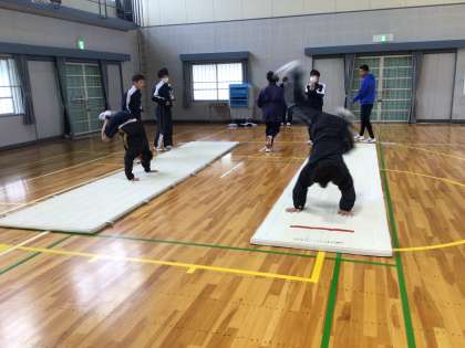 2年生の保健体育科の授業の様子です。マット運動に取り組んでいました。