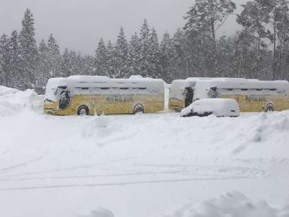 昨日よりも雪が降っていて、昨日乗ってきたバスにもたくさん雪が積もっています。