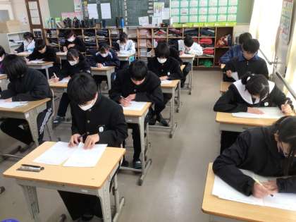 今日は、学習診断テストが行われています。1,2年生は、5教科のテストに取り組んでいます。2年年の理科のテストの様子です。
