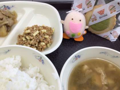 今日の給食の献立は「博物館献立」です。豊田市博物館では、4月6日まで豊田市内の郷土食が展示されています。今日は、そこに展示されている学校給食を再現した献立です。ひまわり型クッキーは、豊田市の花である「ひまわり」をイメージした形になっています。