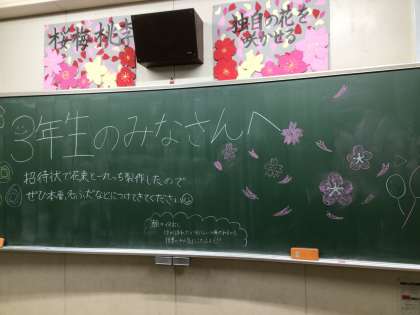 今日は「卒業生を送る会」が行われます。生徒登校前に3年生の教室を見たら、「卒業生を送る会」の招待状が配られていました。1,2年生が心を込めて作ったものです。卒業生を送る会、素敵な会となる予感がします。