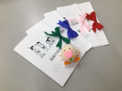 保健室から3年生の皆さんへ、成長の歩みをまとめたものが渡されました。リボンの長さは、小学校へ入学してから今までに伸びた身長の長さと同じになっているそうです。