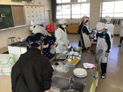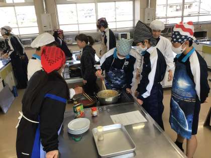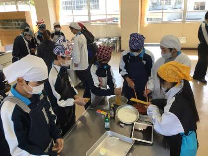 2年生の家庭科の授業の様子です。調理実習をしていました。今日は、パスタ作りに取り組んでいました。