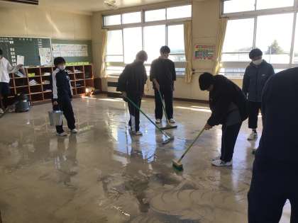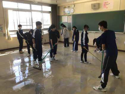 2年生の大掃除の様子です。教室の床の汚れを取り、ワックスをかけていました。