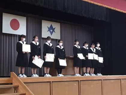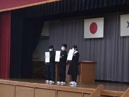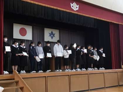 表彰をしました。ブラスバンド部アンサンブルコンテスト、書き初め大会などで受賞されたみなさん、おめでとうございます。表彰されたみなさんの一覧は、学校だより「第18号」に掲載されています。ホームページにの掲載されています。