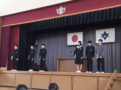 令和7年度の前期生徒会役員の認証が行われました。生徒会長より熱く決意が話されました。