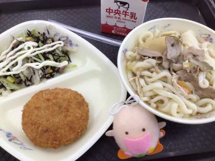 今日の給食の献立は、「たべまるのおすすめ献立」です。肉うどんのつけ汁のレシピが紹介されています。