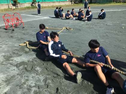 今日から「体育祭特別日課」が始まりました。授業後に約40分間、各クラスが体育祭に向けて練習をしていきます。3年生はリレーと綱引きに取り組んでいました。