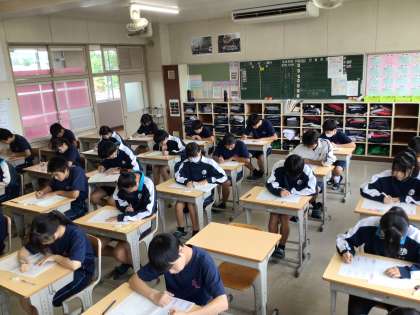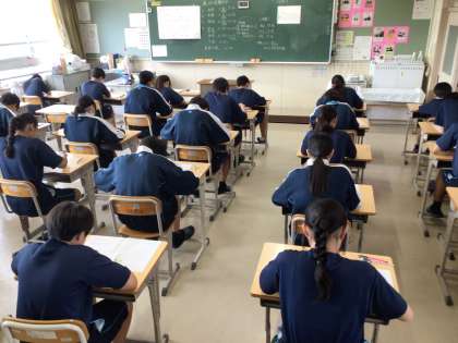 定期テストの2日目です。3年生の様子です。3年生は、卒業後の進路実現に向けて大切なテストとなります。黙々とテストに取り組んでいます。