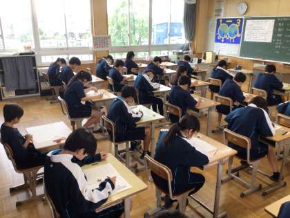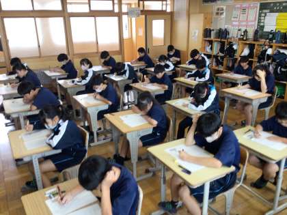 第2回定期テスト最終日の最後のテストに取り組んでいます。1年生の様子です。1年生は、前回のテストは2日間でしたので、今回は3日間となり、準備も大変だったと思います。学習の成果を発揮できたでしょうか。