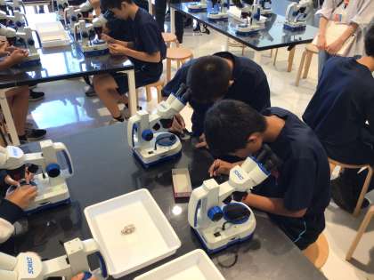 猿投山を地質の視点で学び、顕微鏡で花崗岩の鉱物を観察。