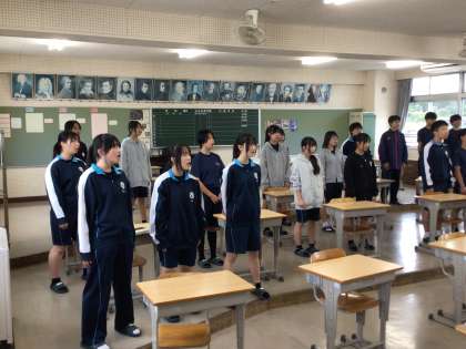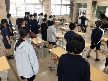 3年生の合唱練習の様子です。音楽室で指揮者に合わせて歌っていました。リーダーが、歌っている仲間の表情を和らげようとしている姿が見られました。