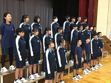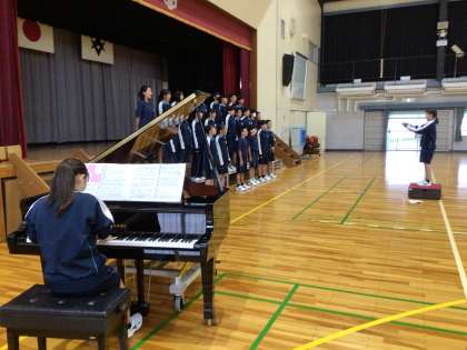 2年生が体育館で練習していました。リーダーが気づいたことを伝え、仲間と気をつけて歌うところを確認しながら練習に取り組んでいました。