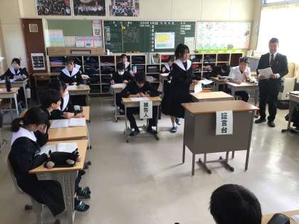 3年生の社会科の授業の様子です。今日は、弁護士の方を講師として招き、模擬裁判の授業を行いました。各クラスとも、真剣な表情で取り組んでいました。後半のクラスには、検察官の方も講師として参加していただきました。