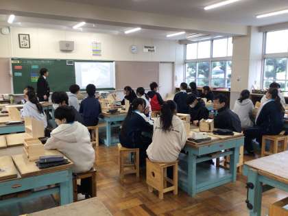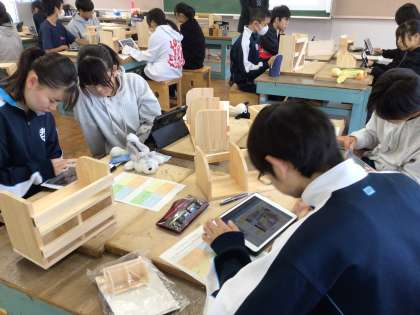 2年生の技術科の授業の様子です。それぞれの作品の良さを見つけていました。