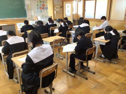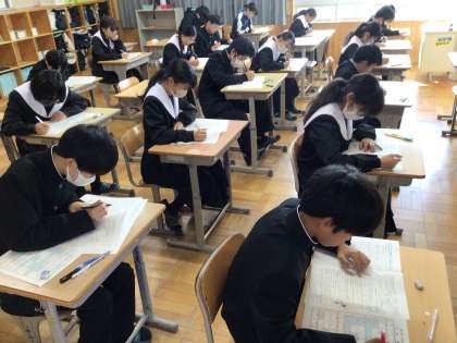 1,2年生は今日から第3回定期テストが始まりました。1年生のテストの様子です。今回は5教科のテストとなります。日頃の学びの成果を発揮してください。