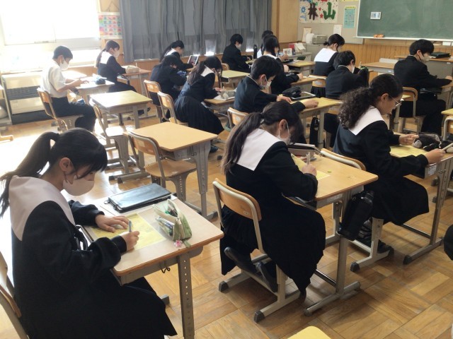 1年生が川柳を書いていました。毎年、本校の近くにある猿投北交流館では、「観桃会」が行われています。その際、生徒の川柳を展示していただいています。今年も多くの作品が飾られることと思います。また、1,2年生は、ボランティアとして活躍する生徒もいます。定期テストが終わりましたら募集をしますので、みなさん、ぜひ応募してくださいね。