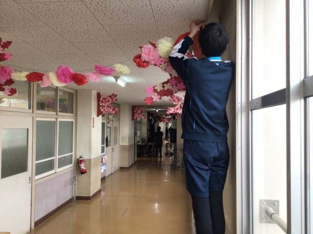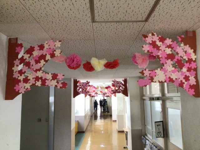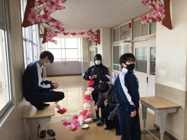 卒業生を送る会に向けて、1,2年生が協力して活動しています。3年生の教室前の飾り付けができました。華やかになりました。3年生の皆さんが、廊下を通るたびに、笑顔になることを願っています。
