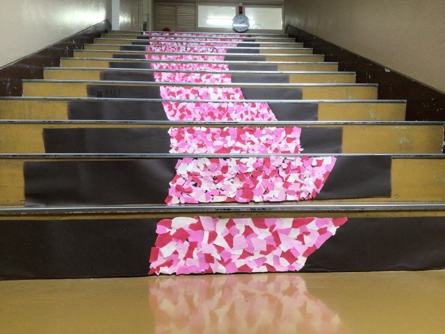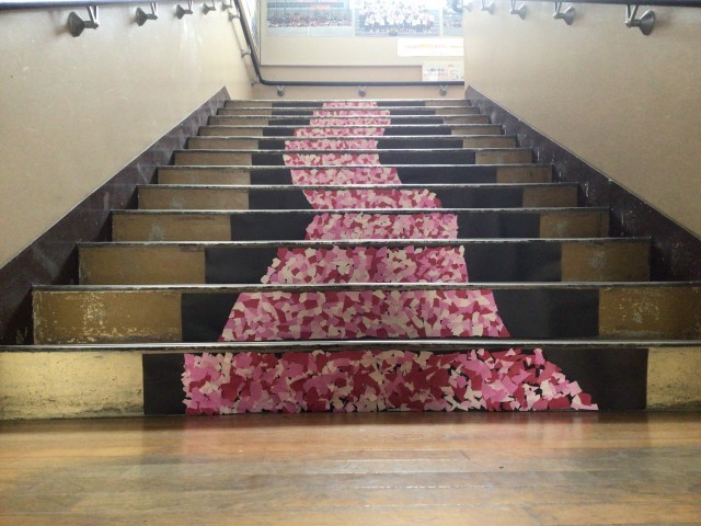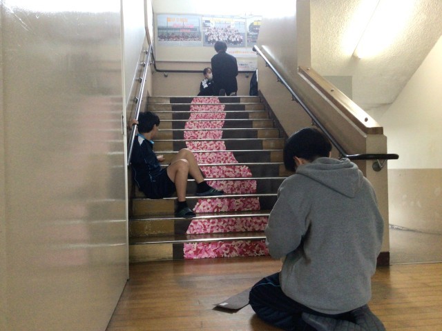卒業生を送る会に向けて活動していました。階段もきれいに飾られていました。3年生のみなさん、もうすぐ卒業ですね。これから、自分の夢に向かって歩み続けてください。この階段の花道を進むように!