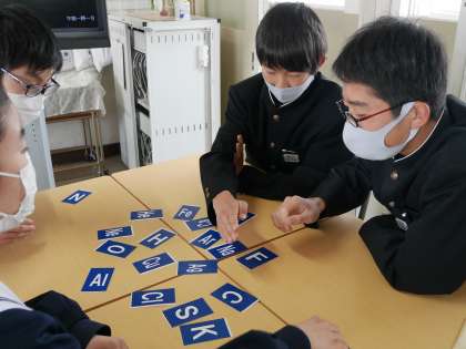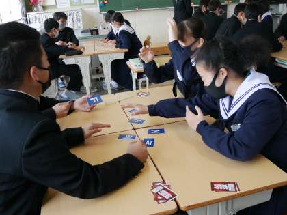 理科の学習で元素記号の学習をしています。元素記号をユニークな覚え方で覚えたり、カルタ取りをしたりしながら楽しみながら学習をしています。Kはカリウム!では、Feは・・・??