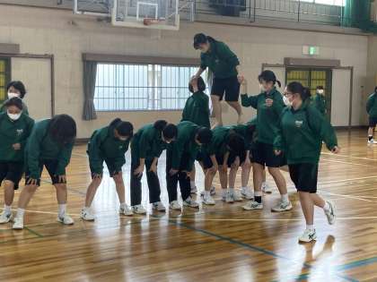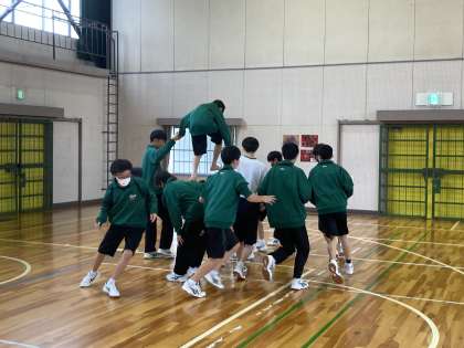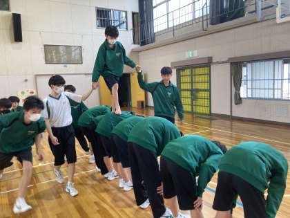 体育の授業で体育祭の競技練習を始めました。今週は、3年学年競遊種目の「龍の背渡り」を練習しています。クラスで協力しながら、ゴールを目指して頑張っています。