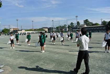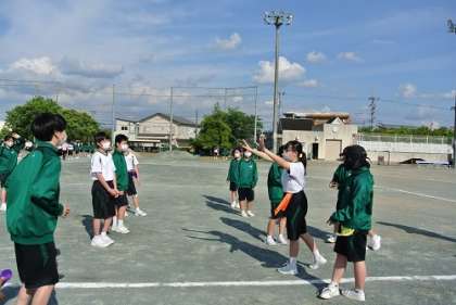 今日も天気に恵まれ、学級の時間に運動場でクラスアピールの練習に励んでいました。