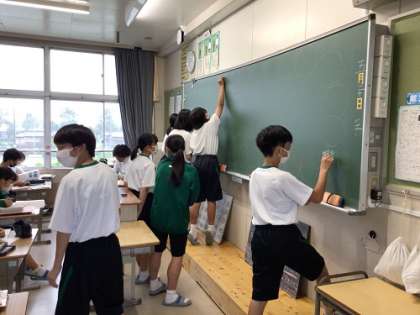 5時間目には学級の黒板に黒板メッセージを書いて気持ちを高めていました。