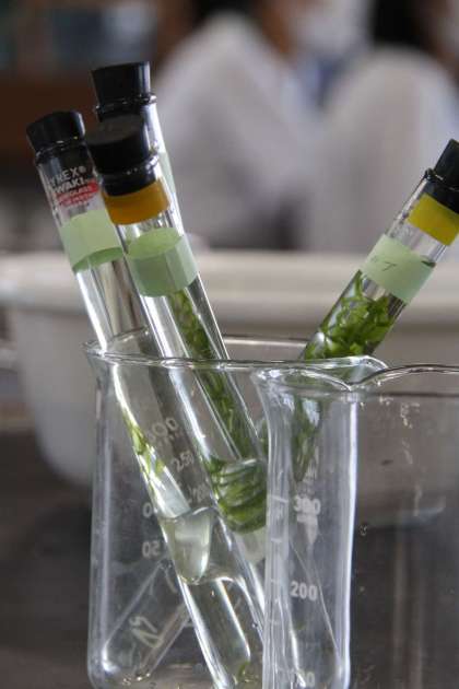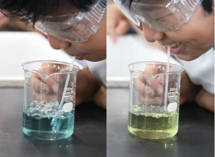 夏休み直前!暑さに負けず学ぶ生徒たち(その2) 公開日 2023/07/18 更新日 2023/07/18 2年生 2年生の理科の授業では、植物の光合成と酸素・二酸化炭素の関係を学習していました。 BTB液に息を吹き込み、二酸化炭素で色を青から黄色に変色させていました。 この後、BTB液に「オオカナダモ」を浸し、植物が光合成で二酸化炭素を使い、BTB液の色が黄色から青に戻るのか検証します。実験中の生徒の表情がいいですね。