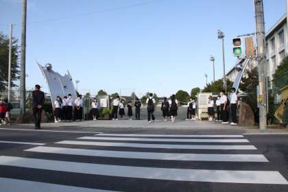 いつもの朝の風景です。生活委員のあいさつ運動は生徒の自主的な参加となっています。生活委員ではない生徒も列に加わり自主的に活動に参加しているため、多くの爽やかがなあいさつが響いています。