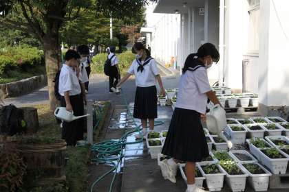 1年生が「菜の花プロジェクト」で育てている菜の花に、水やりをしている風景も「いつもの」日常となってきました。水と愛情を受け、すくすくと菜の花も成長しています。