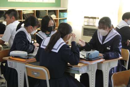 学びあう生徒たち 公開日 2023/11/29 更新日 2023/11/29 全校生徒 授業を見て回っていると、生徒同士が学びあっている場面によく出会います。 教えあう。協力する。意見を出し合う。そんな場面の中では多くの笑顔が見られます。この笑顔を大切にしていきたいと感じます。