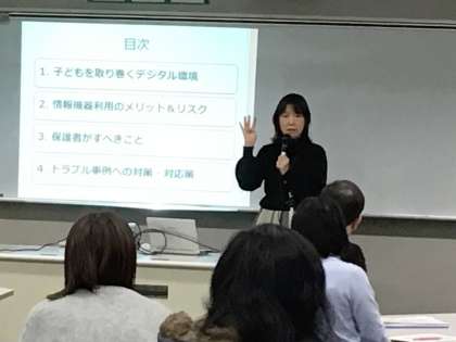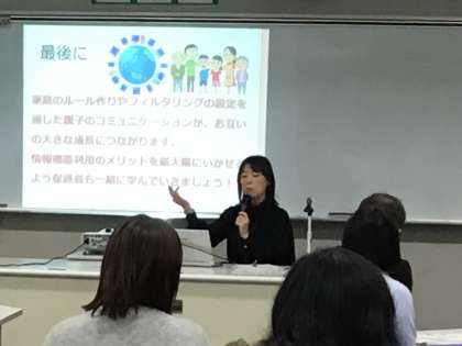 授業参観後、一般社団法人安心安全インターネット塾の勝野祐子様を迎え、教育講演会「子どもへの情報機器の与え方とかかわり方」が開かれました。