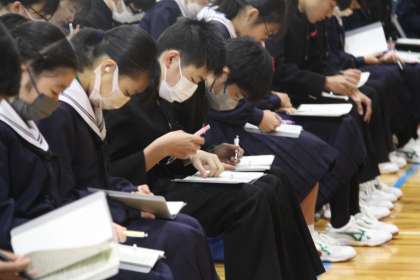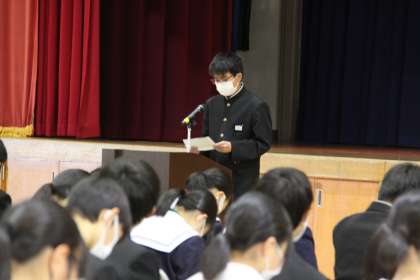 2年生の自然教室は年明け1月16日からとなります。当日までに学校に来る日はあと7日です。今日は朝から実施に向けた説明会が開かれていました。説明には生徒たちが前に立ち、しおりの係のページは生徒たちが書いたページが見受けられます。聞いている生徒たちも久しぶりの宿泊行事とあってよく聞いています。生徒の自主・自立を目指した宿泊行事を目指しています。