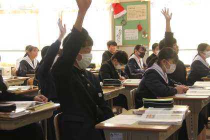 今年最後の授業 公開日 2023/12/22 更新日 2023/12/22 全校生徒 今日の5時間目の授業で、今年の授業は終了です。張り切っている様子。助け合って学びあう様子。笑顔が見られる場面を今年もたくさん見せてくれました。来年も学ぶ喜びを感じられる授業がたくさん行われるようにしていきたいです。