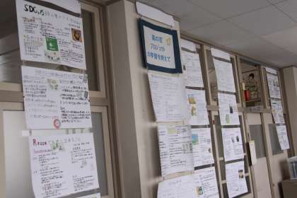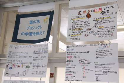 1年生廊下に、菜の花プロジェクトで学んだことをまとめた掲示物が展示されていました。様々な視点から、持続可能な社会を生きていくことを実感していることがうかがえます。