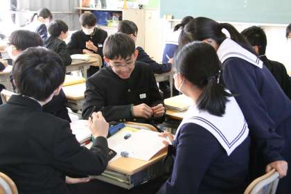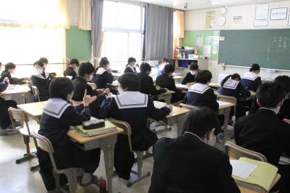 2年生の国語科では「走れメロス」を行っていました。一通り終え、今はその話をもとに、自分たちならこの話をどう脚色するかをグループで考えていました。生徒たちの表情を見ていると、どんな話ができるのか、楽しみです。