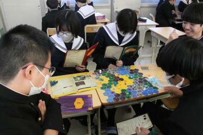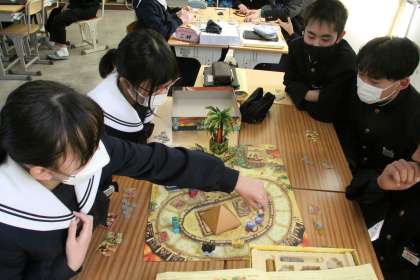 教室から歓声や笑い声が聞こえたので、のぞいてみるとボードゲームを楽しんでいました。学級レクリエーションでもないのにと思っていると、説明文の読解を行う授業の導入と、生徒が教えてくれました。ゲームの説明書を見ると、とても長く、班によっては解読だけで1時間を要したということでした。その上で楽しみ、今後の授業で、ゲームの面白さや、ルールを説明するということです。説明文の読み取り、そして伝えたいことを発信するというスキル。今後生きていく上で大切なスキルですね。