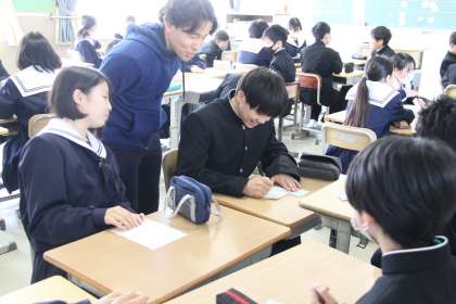 道徳オリエンテーション 公開日 2024/04/12 更新日 2024/04/12 全校生徒 道徳の進め方を全校生徒で理解するため、全学級で同じ題材を使って授業を行いました。考えた課題は「成長」です。最初の考えに固執することなく、友達の考えを聞くうちに変化する生徒もいました。多種多様な考えを受け入れ、自分の考え方を広げていく生徒の様子に感心しました。
