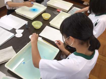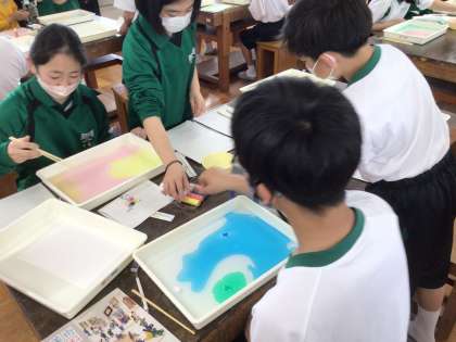 授業参観【1年生その3】 公開日 2024/04/20 更新日 2024/04/20 1年生 本日の授業参観、1年5組では『マーブリング』を行いました。 自分で色合いや完成したものを想像しながら絵の具の色を選び、作品を作りました。 みんなの個性が光る作品がたくさんできましたね!