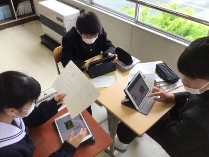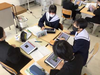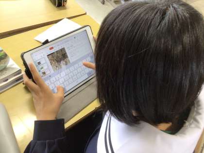 1年生の理科では、先日発見した生き物を学習用タブレットを使い、パワーポイントにまとめていました。
