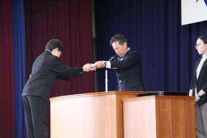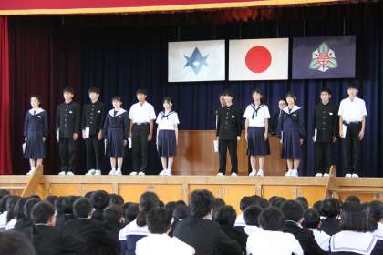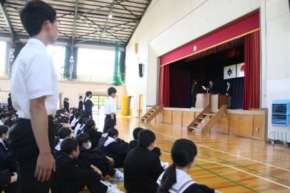 任された思いを胸に【承認式】 公開日 2024/04/26 更新日 2024/04/26 全校生徒 4月25日(木)に承認式が行われました。各委員会委員長。各クラスの級長、書記、代議員の名前が呼ばれると、どの生徒も「はい!」と切れの良い返事で立ち上がりました。音声で聞かせられないのが残念です。代校長より代表生徒が認証状を、手渡されました。任された責務を誇りに感じ、各々の成長につなげてもらいたいです。