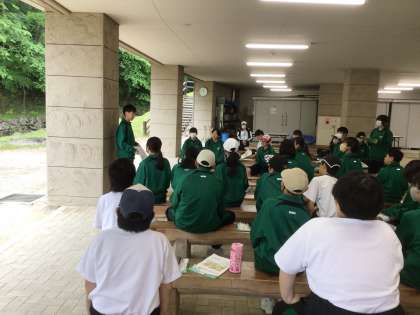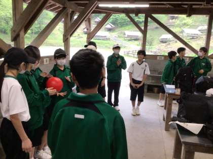 1年生の校外学習はオリエンテーリングを終えたところで雨足が強まってきたため、雨をしのげる場所で学級レクリエーションの実施となりました。