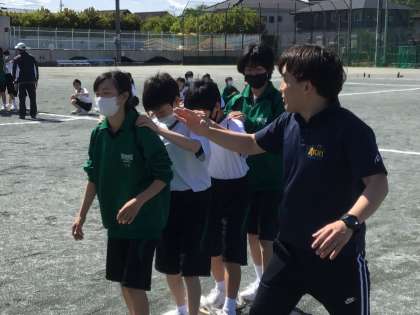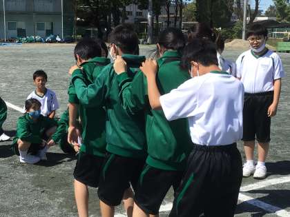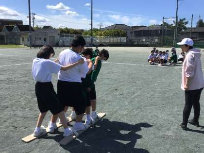 学年種目練習開始! 公開日 2024/05/08 更新日 2024/05/08 1年生 本日から1年生学年種目である『ムカデ競走』の練習がはじまりました。 4人一組で足並みを揃えることの難しさを、1年生は知りました。 掛け声をかけ、仲間を信じて、協力しながらゴールを目指します!本番までにどれくらいタイムを縮めてくれるのか、楽しみにしています!