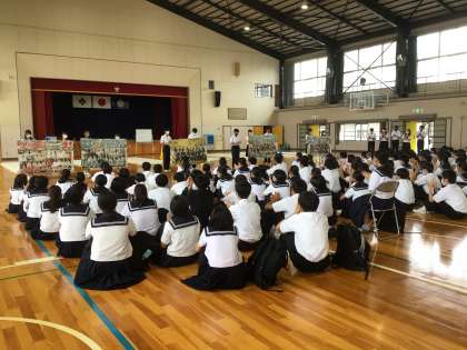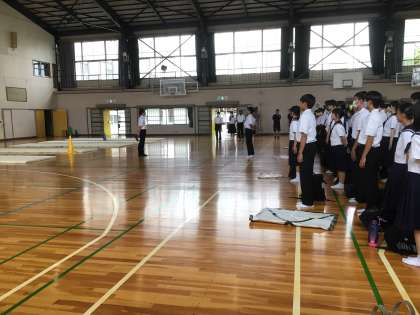 修学旅行に向けて、出発式を行いました。校長先生や代表生徒の話を真剣に聞く様子が見られ、明日の出発に向けてしっかり準備ができている様子が見られました。会の最後には2年生からモザイクアートのプレゼントがあり、「いってらっしゃい」の声と共に受け取りました。3日間、元気に行ってきます!