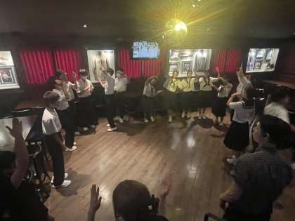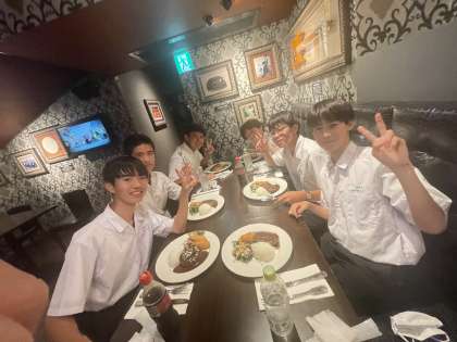 男女それぞれ乾杯の音頭をとって「いただきます!」食事についてきたドリンクが疲れた体に染み渡ります、、、。かとおもいきや、疲れ知らずの2組はまだまだ元気。食後は店員さんのMCに合わせて元気に踊りました。明日は班別研修、楽しんでいきましょう。
