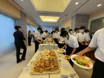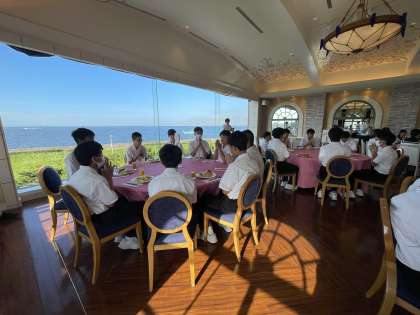 おはようございます。1日のはじまりは一面オーシャンビューの美しい景色をお届けします。会食会場は特徴のことなる2部屋が用意されています。大きな画角から景色を楽しむことができる「オーシャンブルー」。結婚式でも使用される綺麗な装飾が魅力的な「クリスタルチャペル」。美しい景色を堪能しながら朝食を楽しんでいます。