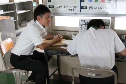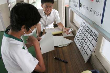 数学パフォーマンステスト【2年生】 公開日 2024/06/27 更新日 2024/06/27 2年生 数学科、連立方程式の単元が終わったところで、解の求め方が身についているかを確認するため、パフォーマンステストを個々に行っていました。問題を1分以内に解く様子を教科担任が確認し、解き方や、理解度を確認していました。解けなかった子にはつまずきを確認していました。できた時には嬉しそうにガッツポーズをする子もいました。できるようになる喜びを感じてもらいたいです。
